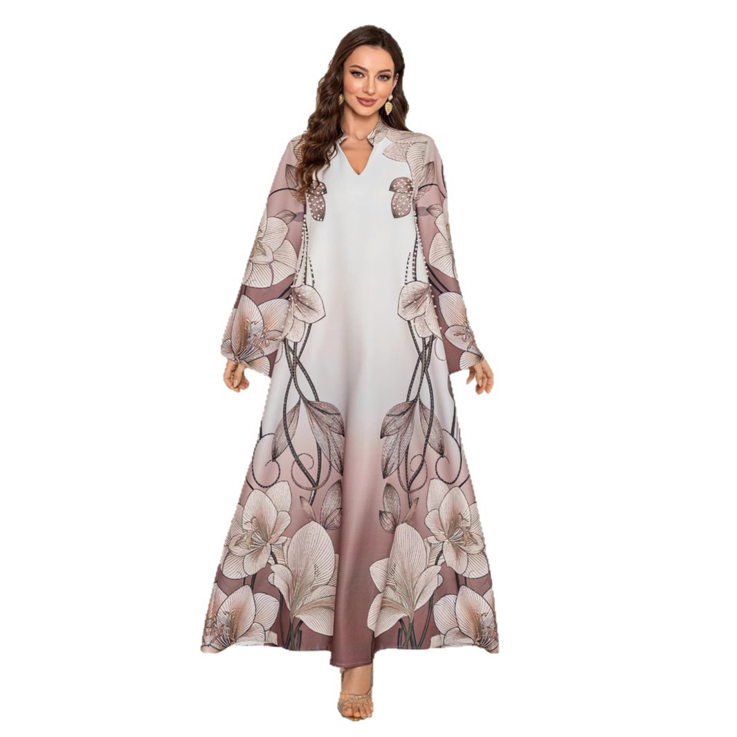 中东跨境穆斯林女装长袍印花钉珠烫钻V领连衣裙外贸批发