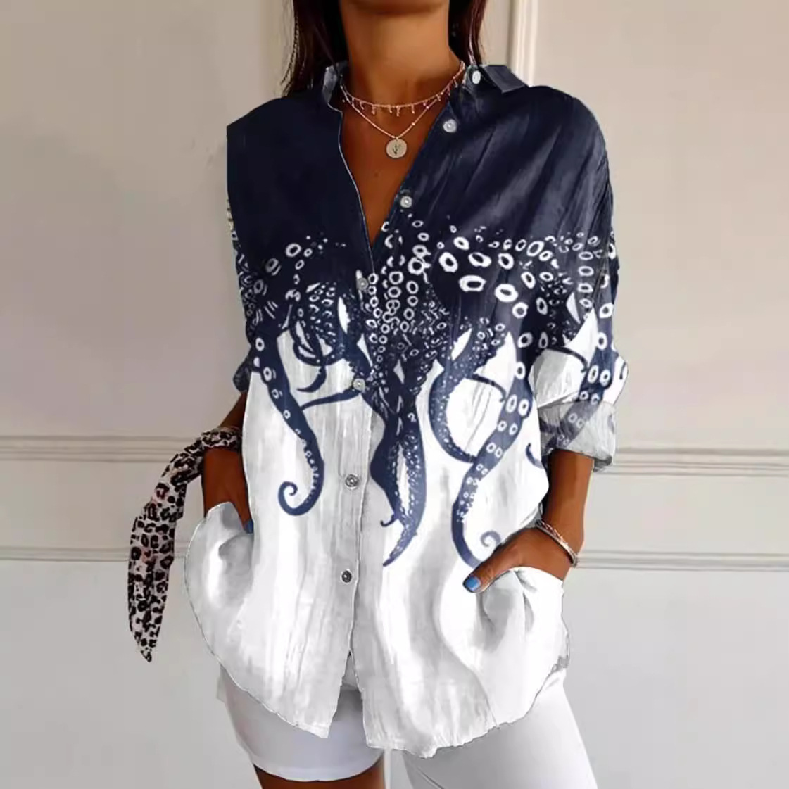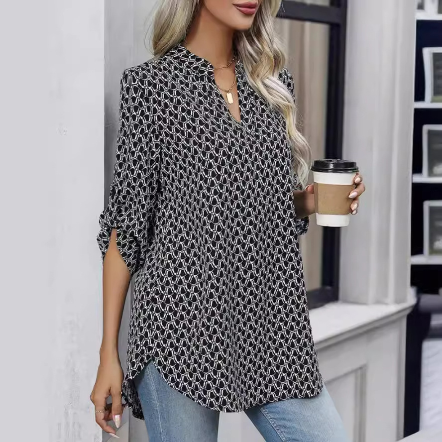 欧美外贸跨境女装2025秋冬亚马逊爆款长袖印花上衣翻领灯 笼袖衬월 판매량 10개재구매율 0%9,300원 * 수입시 예상 단가31.00元