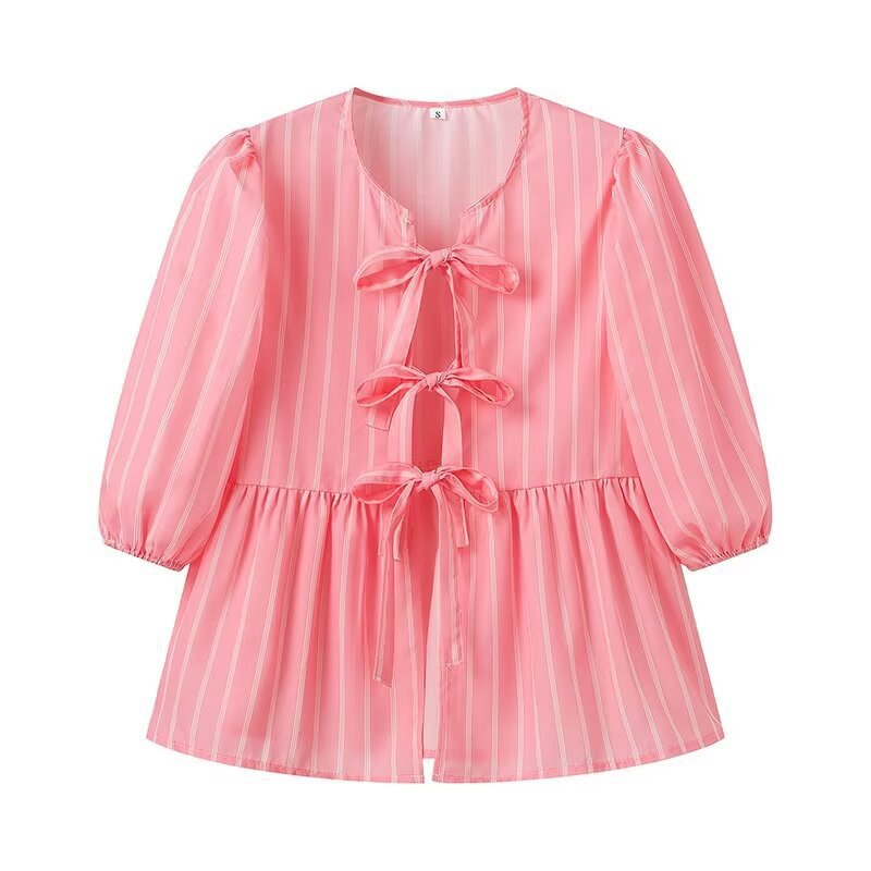 跨境欧美跨境2024爆款竖条纹蝴蝶结系带衬衫甜美宽松圆领五分袖上월 판매량 1개재구매율 0%9,900원 * 수입시 예상 단가33.00元
