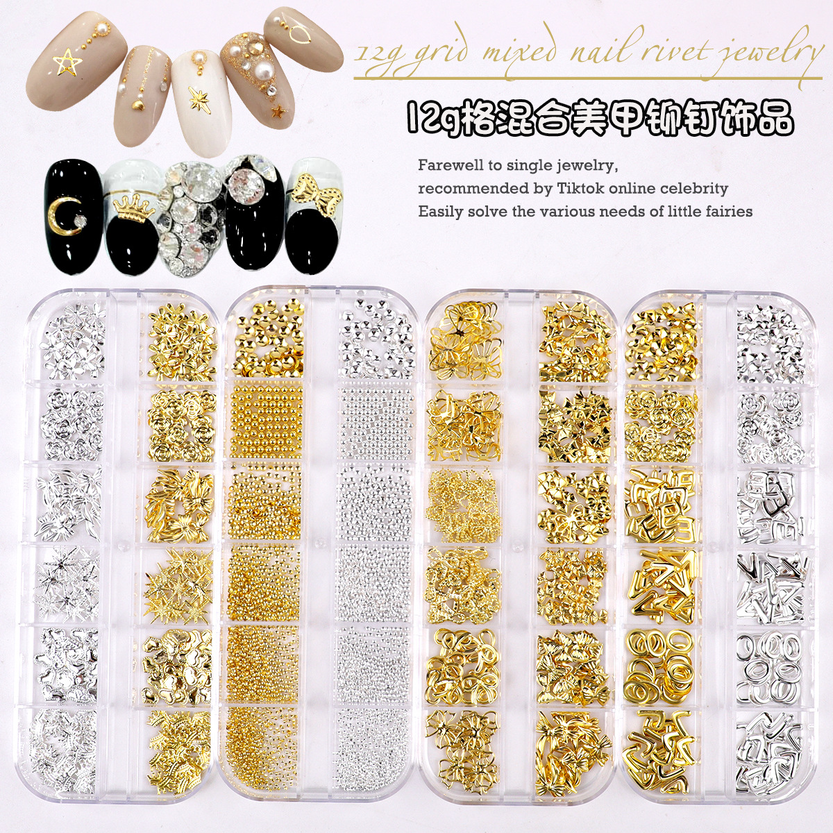 跨境热销爆款美甲铆钉12格美甲饰品金属金银混装铆钉美甲装饰品월 판매량 3586개재구매율 66%1,140원 * 수입시 예상 단가3.80元