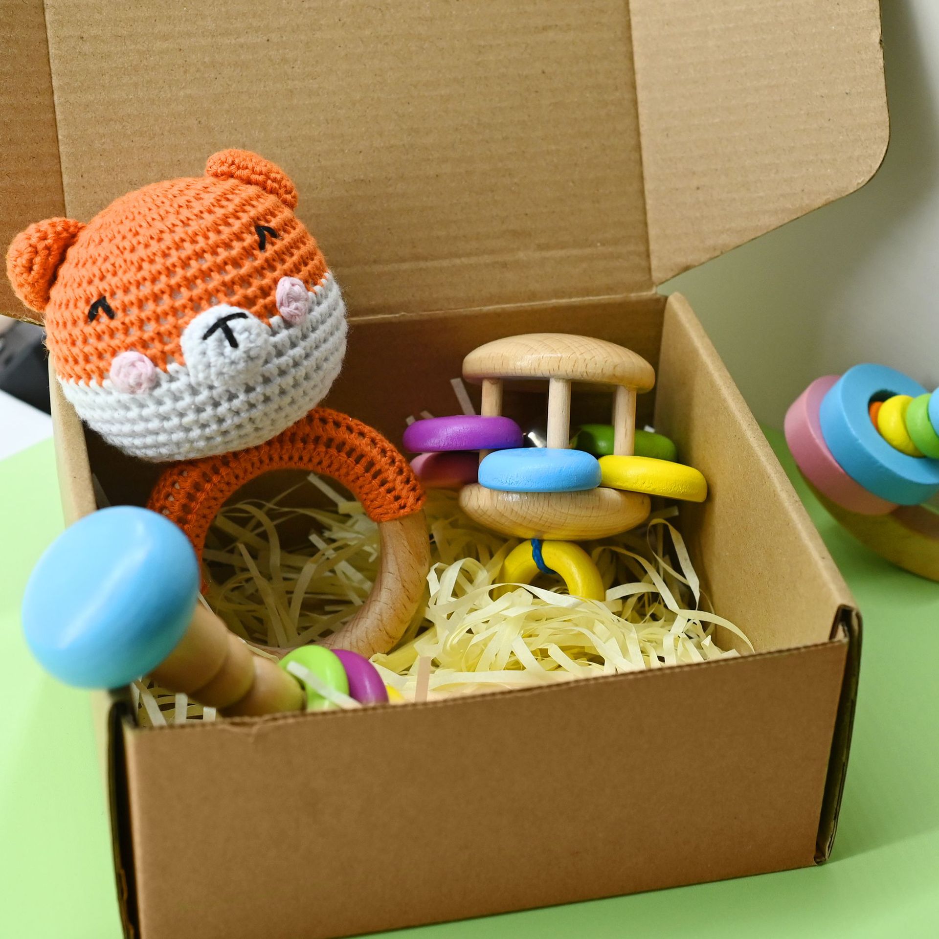 爆款婴儿钩针木制动物摇铃套装礼盒奶嘴链宝宝出生满月礼物월 판매량 21개재구매율 50%14,700원 * 수입시 예상 단가49.00元