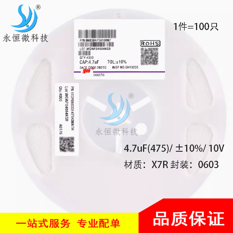 原装0603贴片电容4.7uF(475)±10% 10V X7R 0603B475K100NT 100只월 판매량 0개재구매율 0%1,980원 * 수입시 예상 단가6.60元